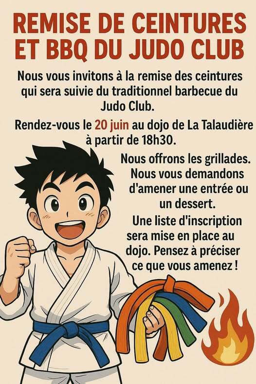 Nous avons le plaisir de vous inviter à notre remise de ceintures suivie du BBQ du Judo Club le vendredi 20 juin au Dojo de La Talaudière, à partir de 18h30.